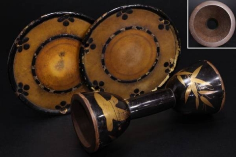 黒漆塗胴に鳥竹蒔絵が施され、鉋目。