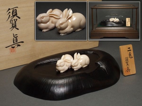埼玉県のお客様より 須賀眞作 白珊瑚「二兎」置物を買い取らせて頂きました。