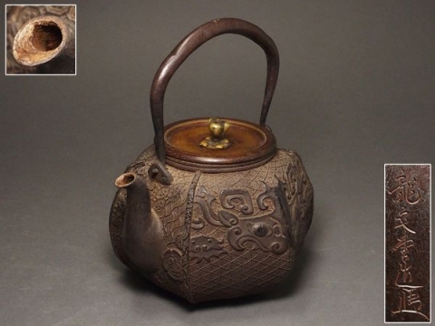 本体には饕餮文が施された珍しい鉄瓶でした。