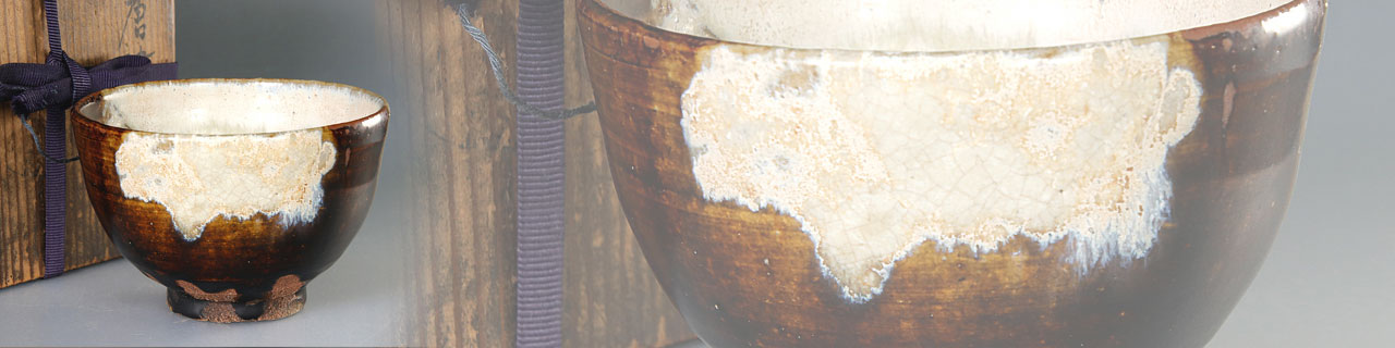 朝鮮唐津は、黒や飴色の鉄釉をかけた上に、白の藁灰釉(わらばいゆ)を流して、落ち具合から景色(釉色の変化)を表現したものになります。